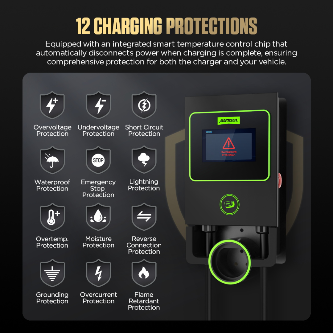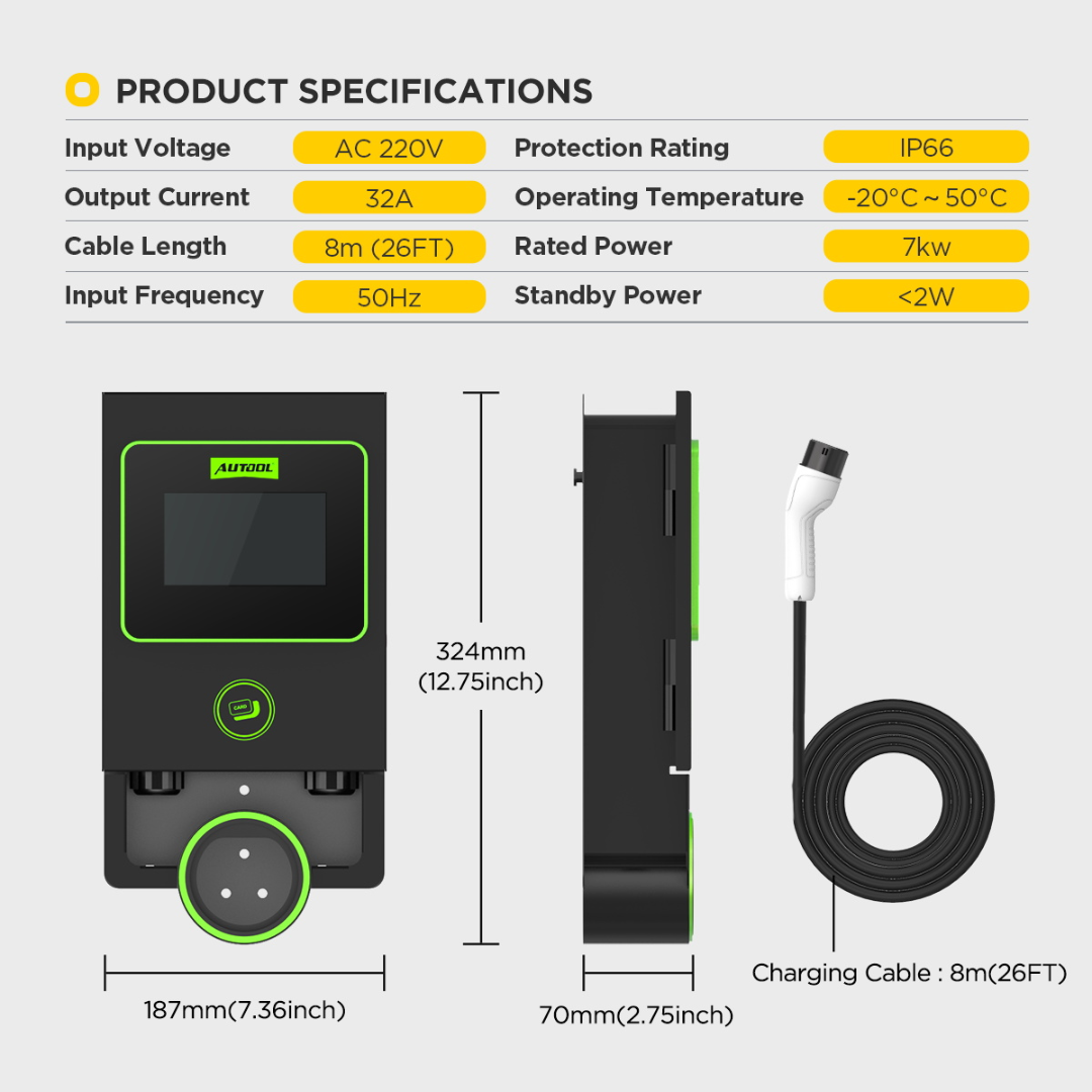 Electric Vehicle Charger:Â The AUTOOL C701 EV home charger comes with a 7KW portable EV charger and an 8-meter-long cable, supporting a maximum voltage of 220V. It is suitable for charging most electric vehicles and plug-in hybrid vehicles.